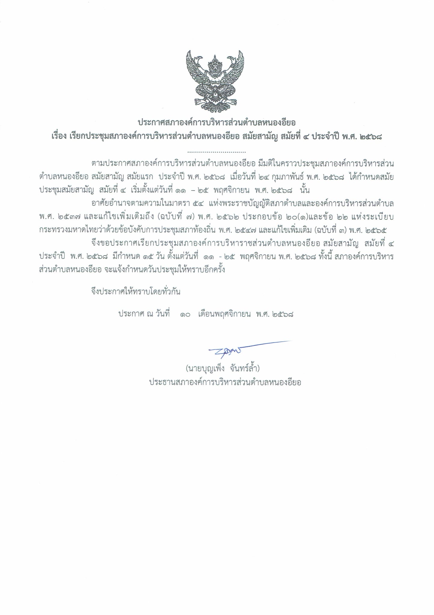 ประกาศเรียกประชุมสภาองค์การบริหารส่วนตำบลหนองอียอ สมัยสามัญ สมัยที่ 4 ประจำปี พ.ศ.2568 ลงวันที่ 10 พฤศจิกายน 2568 เริ่มตั้งแต่วันที่ 11 - 25 พฤศจิกายน 2568